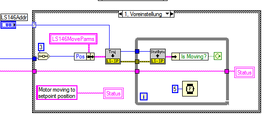 Die Grau-Gelben SubVIs gehören zu einer LabVIEW-Bibliothekt der Fima ISEL, sie gehört zu einer Motorsteuerung "LS146". Mit dem ersten Sub-VI wird die neue Position an die Steuerung übergeben, mit dem zweiten wird der Status so lange gepollt, bis die Position erreicht ist. Also alles ist ganz simpel.