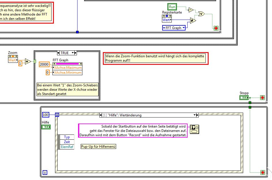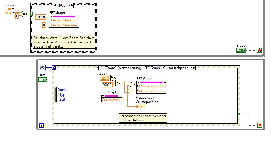 Problem 2: Ich habe ein Zoom-Funktion für den FFT-Graphen. Wenn ich aber meinen Cursor an eine Stelle schiebe und über den Schieberegler zoomen möchte, hängt sich das komplette VI auf!!! Da weiß ich leider nicht wo das Problem ist.