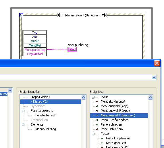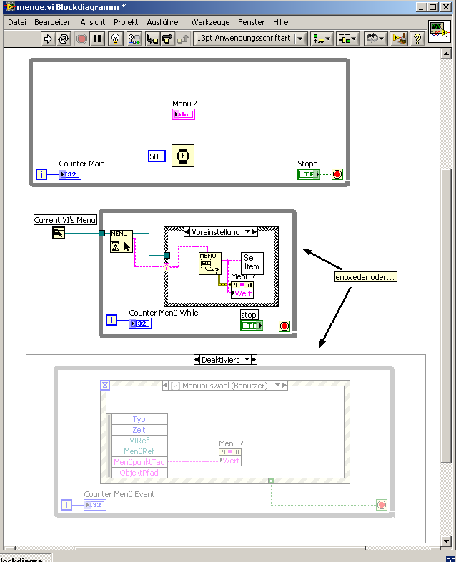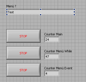 1 Hauptvi, das aus einer Whileschleife besteht, in der 1 Mal pro Sekunde Messdaten von einem OPC-Server geholt, dargestellt und demnächst auch gespeichert werden. Dieses VI hat ein Menü. Jedes Mal, wenn ich das Programm ausführe und einen Menüpunkt aktiviere bzw. mir das Untermenü (zum Beispiel Datei, Hilfe usw.) anzeigen lasse, stoppt die Datenerfassung. Abgesehen davon, dass ich ein Timingproblem bei der OPC-Abfrage bekomme, bleibt die Datenerfassung stehen, solange ich mich im Menü aufhalte. Wie kann ich dieses Verhalten abstellen?