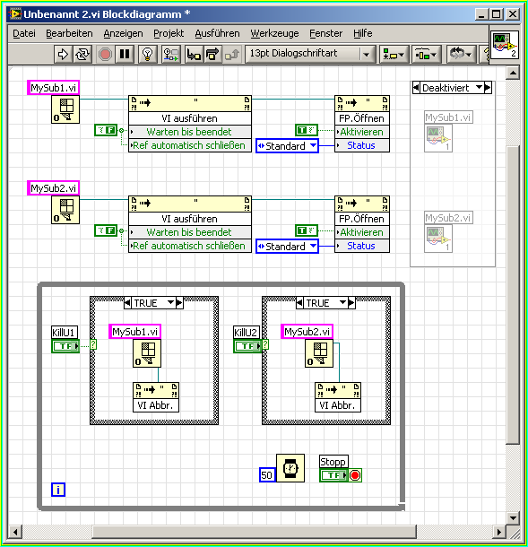 Man kann ja über die VI-Referenz sogar jedes auf dem Frontpanal befindliche Bedienelement zugreifen. Dazu ist es nicht einmal notwendig, daß das auf dem Frontpanel einen Anschluß besitzt. Man kann also vom Haupt-VI aus über die SUB-VI Referenz einfach die Stoptaste drücken.