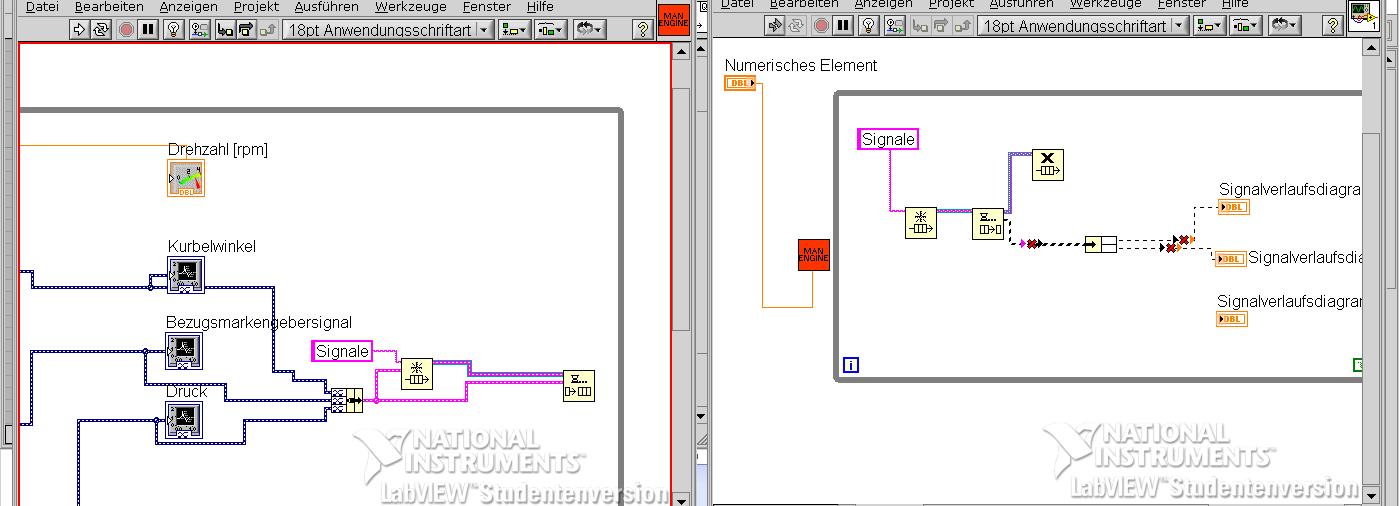 Das erste Problem stellt sich schon wenn ich die Whileschlaufe im SUBVI weglasse, dann läuft dieses nurnoch ca 0.1s und dann beginnt das Blockdiagramm schwarzweiss zu blinken, könnte etwas mit den eingebauten Datenverlaufsdiagrammen zu tun haben, denn wenn ich nur diese in eine Whileschlaufe packe, blinkt es nicht mehr, allerdings ist dann das Signal auch nur bis ca 0.1s und somit nicht kontinuierlich.