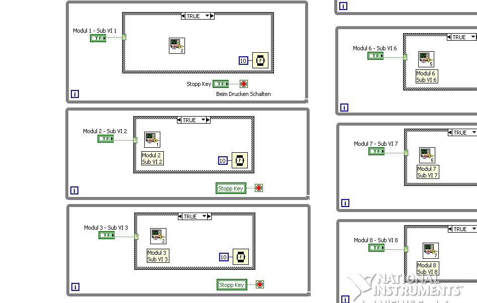 Zitat:insgesamt habe ich 9 parallele schleifen zum Haupt Messdaten erfassung schleife. (die eigenlich die erfasste messwerte zeigen und nix mehr.) Für meine parallele Schleifen habe ich eine warte zeit . damit nicht gleich alle laufen. (die sind eigenlich mit einem boolische bottum verbunden, damit sie als pop up fenster sich öffnen.) screenshot 4