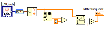 Mein aktuelles "sub"-Problem befasst sich mit der Berechnung der Medianfrequenz (manche nennen sie auch Mittenfrequenz) aus einem FFT Frequenzspektrum. (Die Medianfrequenz ist genau die Frequenz, die die Fläche unterhalb eines Frequenzspektrums in 2 gleich große Teile teilt.) Mit MatLab (offline) war es kein Problem aber in LV bin ich mir sehr unsicher, weil ich nie sehe/verstehe wie mir die Daten grade zur Verfügung stehen.