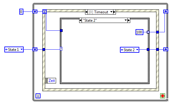 Die State-Cases befinden sich alle im Timeout der Ereignisstruktur. Wichtig ist, daß in den States kein Waits stattfinden, auch langes Warten auf Datenempfang etc. sollte vermieden werden (Z.B. bei Warten auf Datenempfang: Timeout im Ereignsicase so einstellen, daß beim Übergang zum Dantenempfangs-Case schon alle Bytes im Empfangspuffer sind. Oder den Datenempfangs-Case mehrere Male pollen, bis alle Daten im Buffer sind) . D.h. alles Warten, wenn erforderlich, sollte möglichst immmer über den Timeout-Anschluß der Ereignsistruktur realisiert werden, wobei die Timeout-Zeit nicht konstant sein muß, sondern sich über Schieberegister für jeden State individuell anpassen läßt.