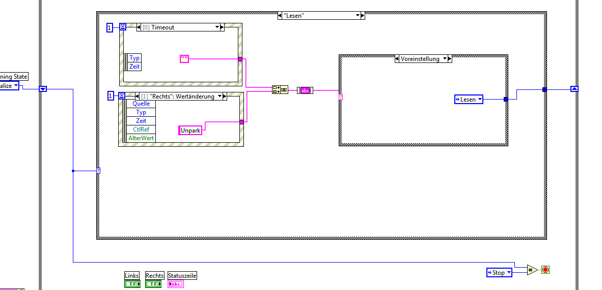 Das wäre ja schon okay, aber mein Problem liegt dann für mich immer noch bei der Behandlung der Buttons. Bspw. hätte ich jetzt 5 Buttons, die alle auf einem FP abgefragt werden sollen. Soll ich fünf Ereignisstrukturen erstellen oder dann doch fünf Case-Strukturen? Und mein (wahrscheinlich triviales) Problem ist dann noch: Wie gebe ich dann die verschiedenen Enums auf das Schieberegister? Wenn ich mehr wie ein Enum anschließe, erhalte ich ja eine Fehlermeldung...