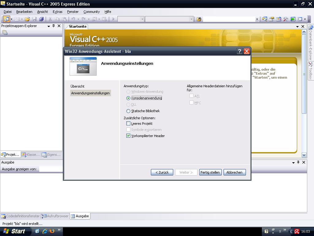 wie dem auch sei ich habe die konsolenanwendung gewählt und den haken bei "vorkompilie. header"