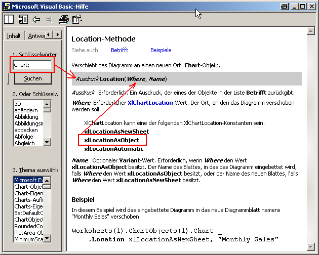 Zur Abwechslung bemühen wir mal die VBA Hilfe von Excel und suchen nach Chart: