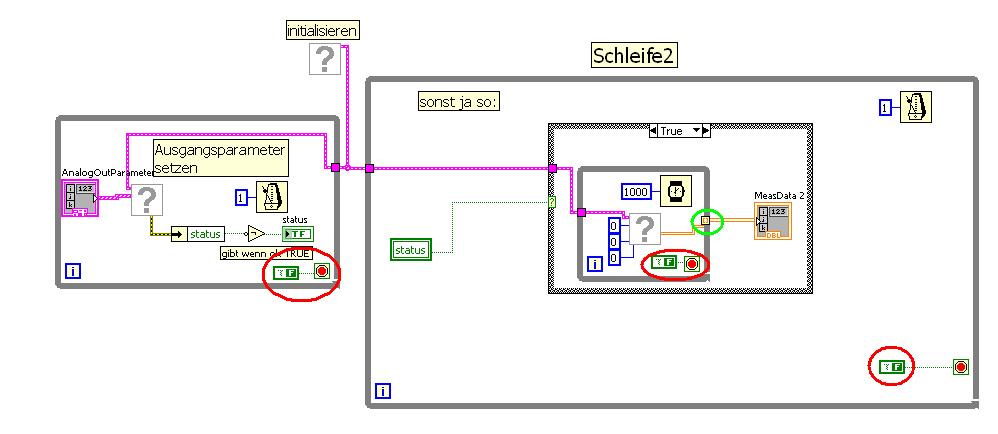 Zitat:3.) Wenn du nicht willst das alles andere nocheinmal abgearbeitet, sprich du willst das ganze Programm anhalten, dann würde ich ne Warteschleife einbauen!! In deinem Fall: Beim Ausgangsparameter setzen einfach den Status mit dem Ende der Schleife verbinden. Die Konstante musst natürlich weglassen. Das erspart dir auch die Status Variable!!!
