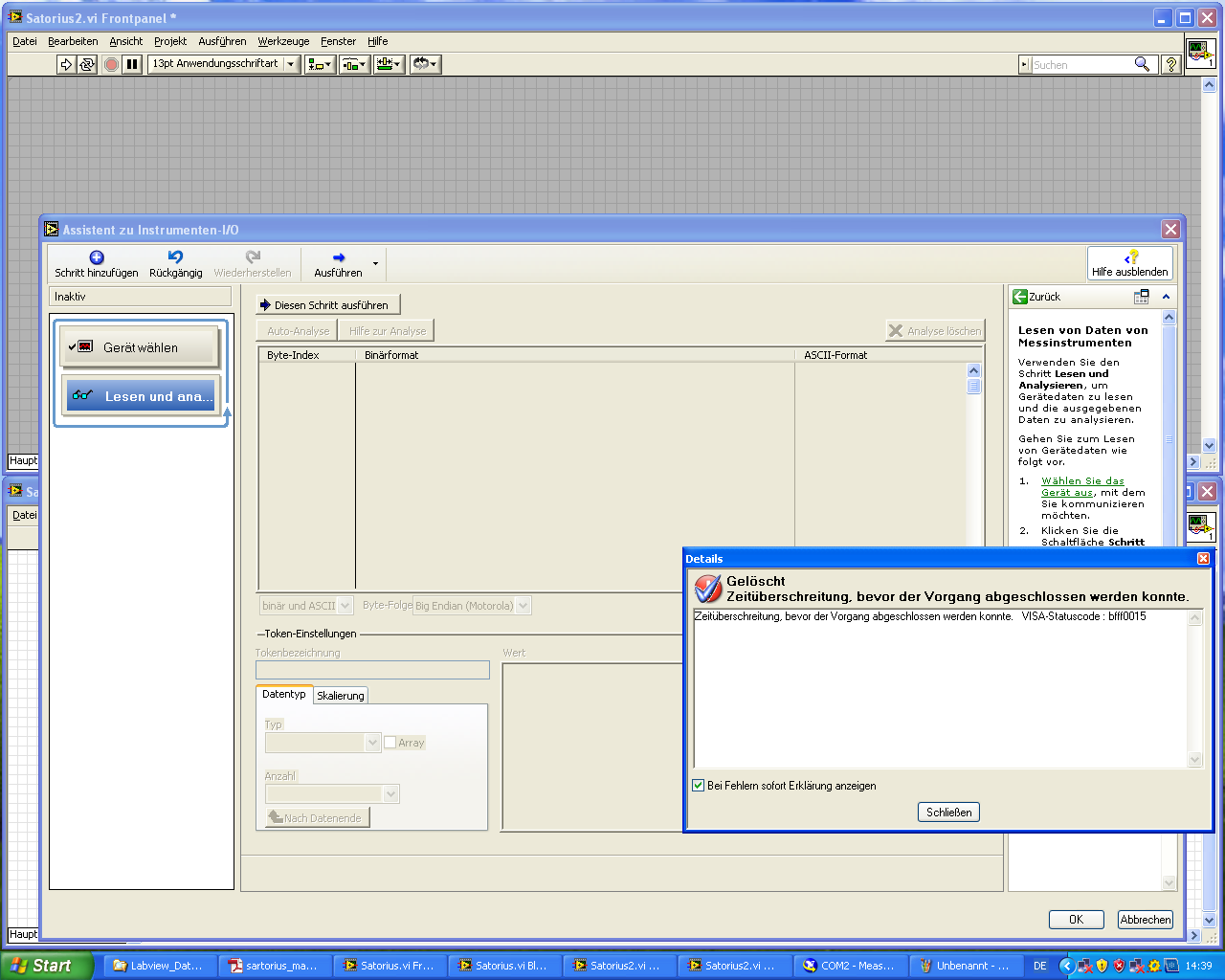Will ich z.B. Schritt 2 wählen: "lesen und analysieren" bekomme ich einen Fehler: Zeitüberschreitung: VISA-Statuscode: bfff0015. (siehe A-IO.png)