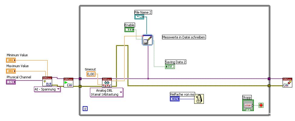 Ich habe noch etwas an den Dateien rumgebastelt (Samplerate angepasst, Graphen rausgenommen...) und komme nun auf immer ca. 200ms. Mal mehr mal weniger. Anbei der Quelltext, ich schreibe mit WriteSingle. Der Sprung liegt von ner bestimmten Zeit, die ich durch den Vergleich ermittle bis zum Ende der Messung an (Vergleich wird nicht im Frontpanel angezeigt, könnt ja Geschwindigkeit kosten ;-)).
