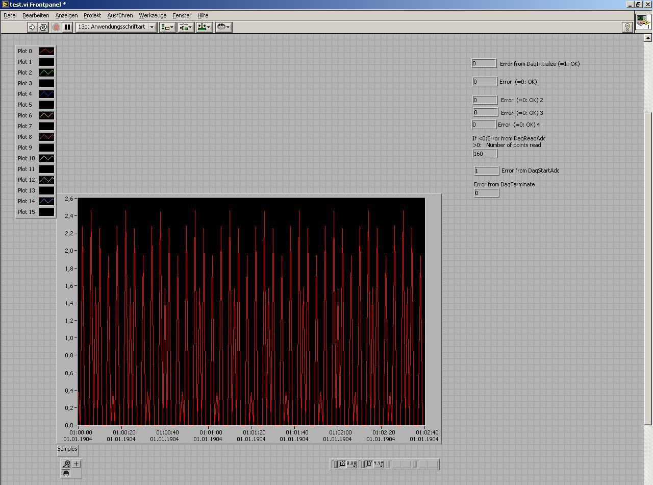 Zur Zeit werden die Daten anscheinend komplett eingelesen bzw. aneinandergelegt und ich bekomme sie irgendwie nicht getrennt oder in verschiedenen Farben dargestellt (s. Bild Frontpanel). Die Plots sind auf verscheidene Farben eingestellt, aber es wird nur eine Gesamtkurve in rot eingestellt. Wenn ich von 16 Kanälen auf nur einen Kanal umstelle klappt dies und es wird bsplw. eine Kurve/Linie bei bsplw. 2 Volt angezeigt.
