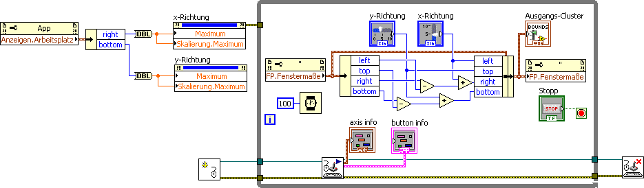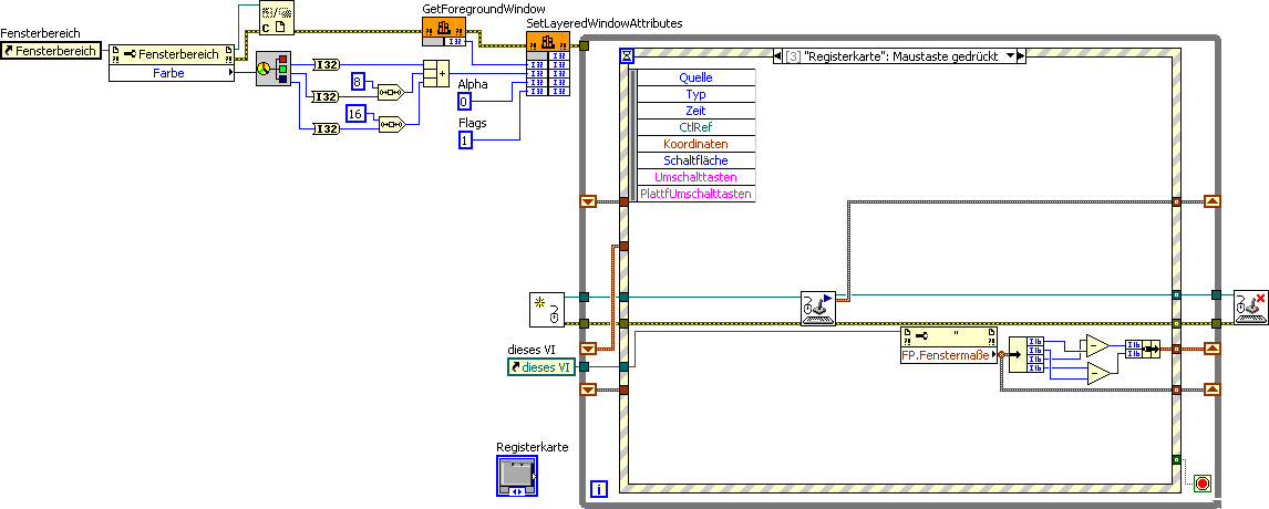 Das hört sich schon sehr vielversprechend an, aber ich fürchte als Anfänger fehlt mir das ein bisschen das Hintergrundwissen;)Zumindest habe ich schonmal eine Ereignisstrucktur gemacht, die "Maustaste gedrückt" im "Festerbereich" abfängt. Aber die Position der Maus im Timeoutframe der Eventstruktur pollen übersteigt noch meine Fähigkeiten : /