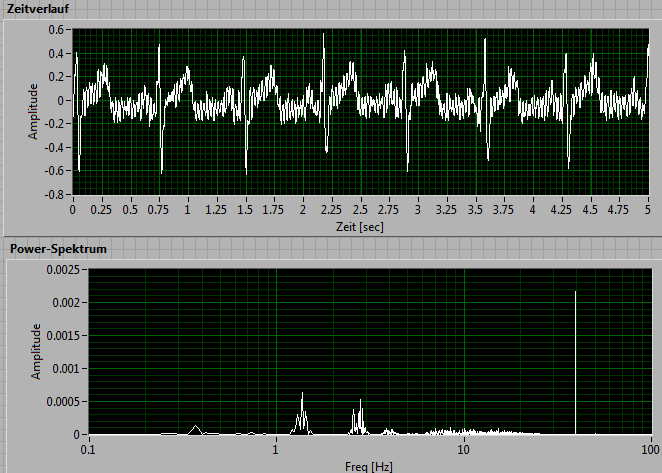 [st]Was sind denn hier Störkomponenten? Bei den 1.4 Hz, 2,8 Hz, 4 Hz- Peaks handelt es sich um die Herzfrequenz mit Oberwellen - soweit klar. Aber die alles andere dominierende 40 Hz-Frequenz, ist das eine Störung oder kann man die medizinisch erklären?