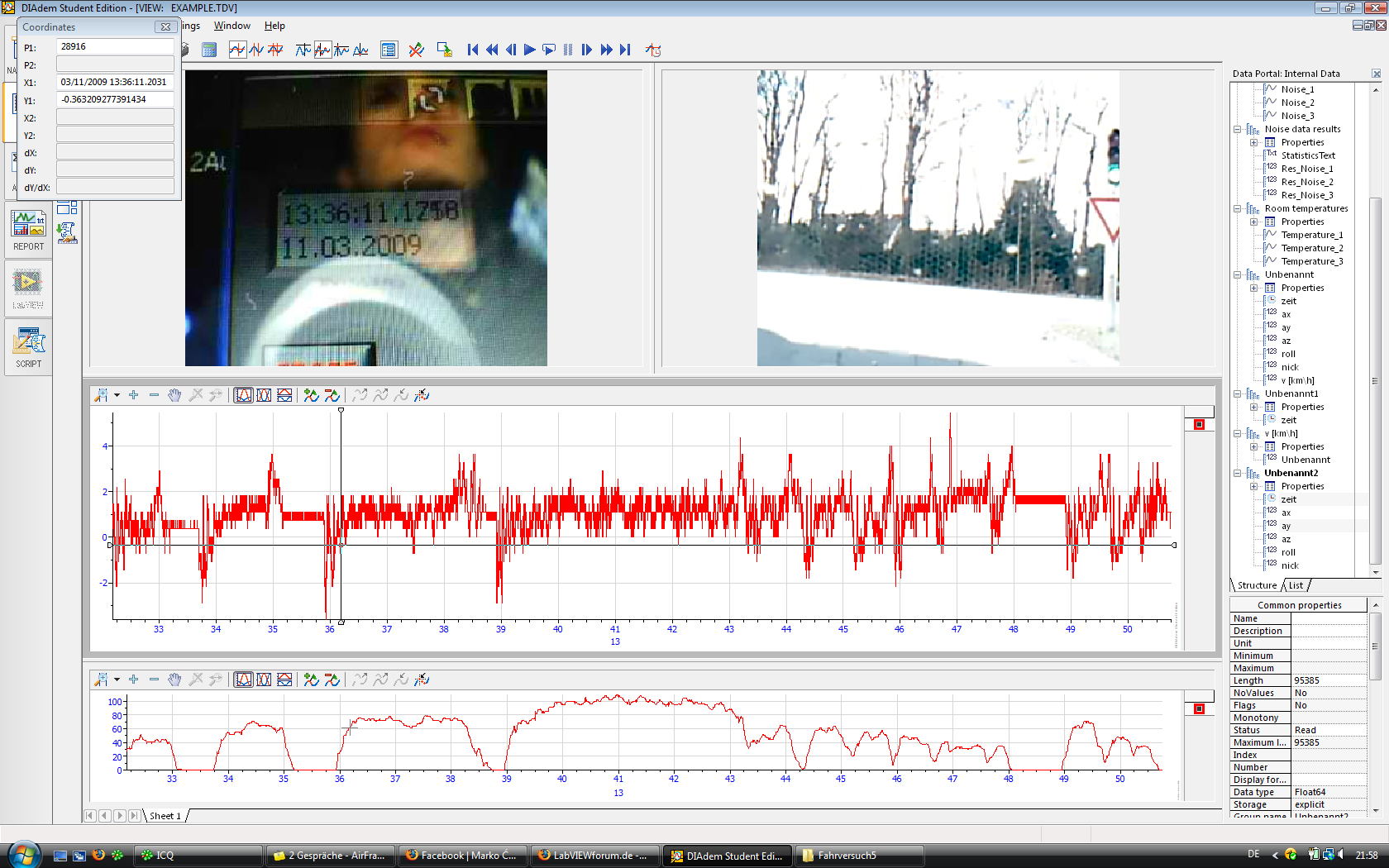 Mit diesen Daten gehe ich dann in Diadem und synchronisiere sie über meine Systemzeit. Die Synchronisation funktioniert sehr gut. Meine aufgenommene Systemzeit vom Video weicht nur um paar 100stel von den Zeitwerten meiner Messwerte ab und das während des ganzen Versuchs. In Diadem kann man sich zu jedem Wert auch die Koordinaten anzeigen. Das funktioniert echt super.