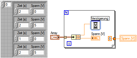 Wie bekomme ich das Array unten aufgeteilt? Zur Verzögerung darf dann ja nur die Zeit hin, und zur Ausgang nur die Spannung. Ich habe leider keine Ahnung, mit welchem Baustein das möglich ist. Habe grade schon einige ausprobiert, leider nur mit mäßigem Erfolg...