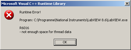 Die Fehlermeldung hat aber wohl nichts damit zu tun. Was hier passiert ist, dass der LabVIEW Code, der in C++ geschrieben ist einen ungültigen Parameter erlebt hat. Das verursacht eine Exception in der Library Funktion die aber vom aufrufenden Code nicht abgefangen und behandelt wird. Daher endet die Exception im Standard Exception Handler der verwendeten Library und der kann nicht viel mehr tun als eine Message Box anzeigen. Von da aus gibts zwei Alternativen: Die Applikation abschiessen oder weiterlaufen lassen. Die zweite rennt dann wegen irgendwas gleich wieder in diese Exception und alles beginnt aufs Neue. Nach ein paar mal in diesem Hamsterrad rundgedreht zu haben beginnt die C++ Runtime Library doch langsam Stack- oder andere ähnliche Problem zu bekommen und von da an geht es nur noch in mehr und mehr komischen Fehlern weiter bis irgend ein Exceptionhandler ganz einfach das Ganze brutal abschiesst.