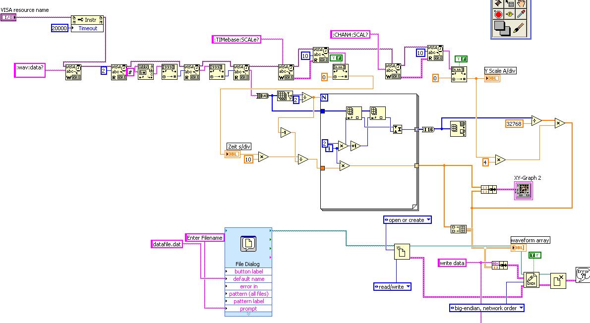 Habe das säuisch liederlich angeordnete VI geordnet und die ganze VISA-Datenerfassung weggelassen und durch simulierte Daten ersetzt. Außerdem habe ich die mir unverständlichen 2 Express-Vis zur Erzeugung der Dateinamen gelöscht. Beides ist ja unwichtig in Bezug auf das eigentliche Problem.