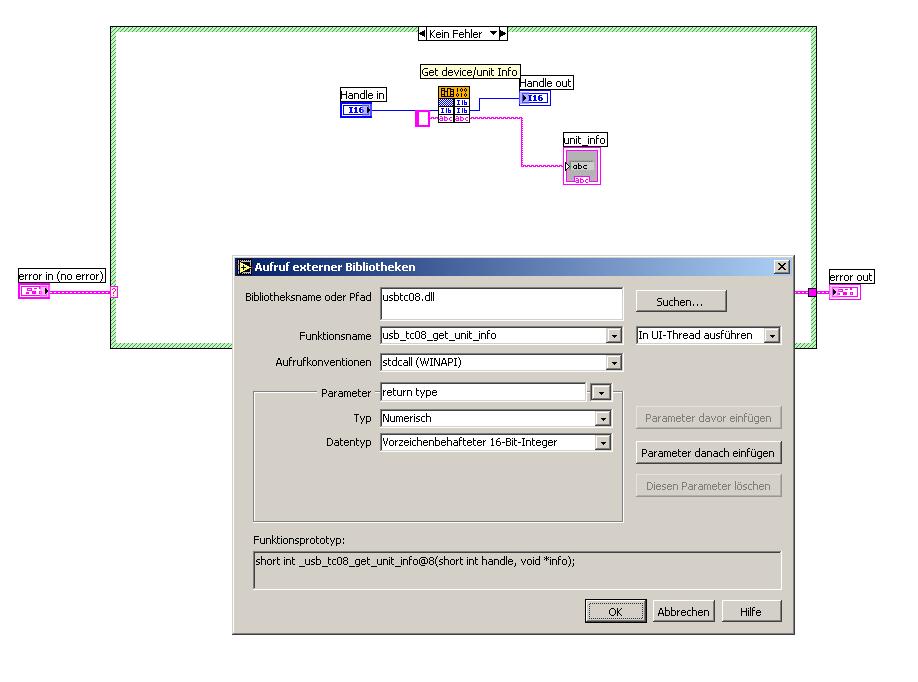 Import der Funktionen mit dem LV8.6-Dll-Assi geht hervorragend, sogar solche Aufrufe wie usb_tc08_get_unit_info werden importiert.