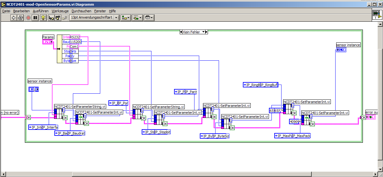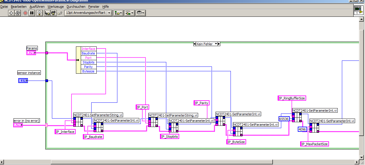 Guckst du Bild: Der DLL-Knoten im SubVI NCDT2401-GetError ist falsch konfiguriert. Die Funktion in der DLL erwartet einen Pointer auf einen Speicherbereich. Der Bereich muss aber auch vorhanden sein! Das wird dadurch gewährleistet, dass im DLL-Knoten für die "Mindestlänge" des "C-String-Zeigers" der Werte "maxlen" ausgewählt werden muss.