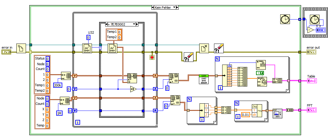[*]Beim Einlesen werden die beiden U16-Werte hinterereinander als ein U32-Wert gelesen, es wird dann weniger oft gelesen und die ganze Struktur vereinfacht sich. Es gib nur noch eine Casestruktur mit den 3 Cases x7E7E0002, x7E7E0003, Voreinstellung.<>