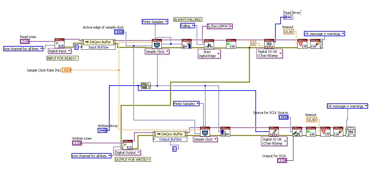 Ich generiere mir mittels einer NI6537 I/O Karte den Sampleclock, und nehme diesen Clock als Takt für meine SPI Anwendung, was ansich auch funktioniert (so dachte ich jedenfalls). Jetzt hat sich aber gezeigt, dass dieses Teil zwar die Flanken schön ansteuern kann aber das CS (Chipselect) genau in der gleichen Flanke "low" wird wenn meine SampleClock hochgeht. Dies bedeutet im Endeffekt undefinierter Zustand, und ist für mich extremst unbrauchbar. Ich kann leider keinen Screenshot zeigen da ich keine Software für das Oszi habe, aber man kann sich einfach vorstellen wenn man den Bereich vom Oszi aufzoomt dass in dem Moment wo CS low geht die Clock auf High geht, und zwar just im gleichen Moment. Dry