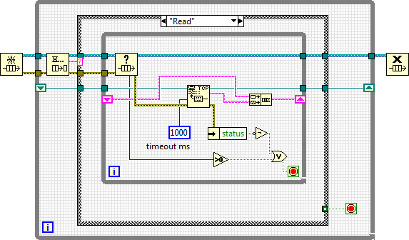 Aber...ich hab z.B. das Problem das ich über einen Counter ein TTL-Signal erfasse. Dieses TTL-Signal wird durch ein sich drehendes Rad über einen speziellen Sensor erzeugt. Nun ist es so, dass das Rad sehr schnell drehen kann (3000 U/min, das entspricht dann einer Signalfrequenz von ca. 52 kHz)...aber auch sehr langsam (nahezu Stillstand)...die Frequenz ist dann auch SEHR niedrig. Von einem TTL-Rechteckimpuls zum nächsten kann es dann schon mal 1-2 Sekunden dauern. Die Rechteckpulse sind abhängig von verschiedenen Bedingungen unterschiedlich breit, darum wird hier über den Counter eine Pulsbreitenmessung durchgeführt. Damit ich beim DAQmx-Read des Counters keine Fehlermeldung produziere, muss eine Timeout-Zeit spezifiziert werden (entsprechend der niedrigsten möglichen Drehzahl bzw. Signalfrequenz). Wenn das DAQmx-Read dann in der Consumer-State Machine (State "Read counter") untergebracht ist, wird in diesem State dann halt entsprechend der Timeout-Zeit gewartet, bis ein neuer Puls kommt. Drückt der User in dieser Zeit (über die Producer-Event-Struktur) auf den Abbrechen-Button, wird das Programm aber nicht sofort beendet...eben weil das Read-VI noch nicht fertig ist. Der Abbrechen-Button reagiert zwar sofort und schreibt den neuen State "EXIT" in die Queue, diese wird aber erst nach der Timeout-Zeit des Read-VI im nächsten Schleifendurchlauf abgefragt...