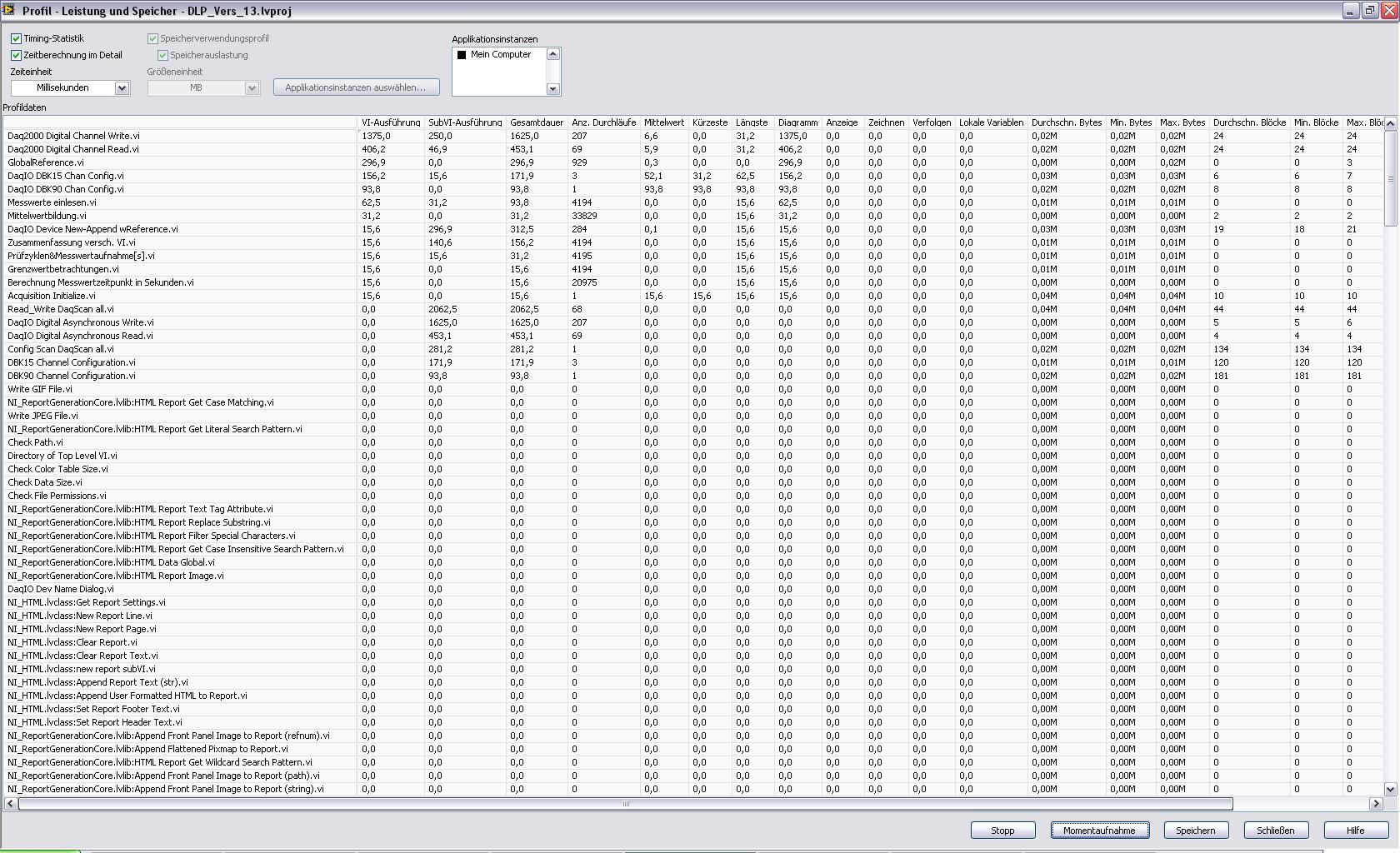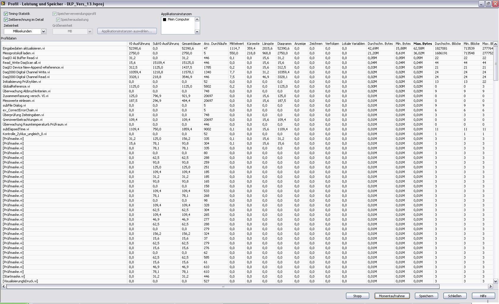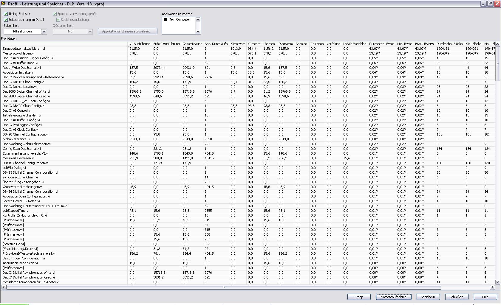 Jetzt die Frage: Wie find ich genau heraus welches VI den Speicher und damit die Auslagerungsdatei so zumüllt? Ich hab es mit der NI-Funktion Profil-->Leistung und Speicher probiert jedoch zeigt mir das beim Speicher immer den gleichen wert an bzw. das maximum. Heisst das für mich dass bei jedem Aufruf dieses VI´s dieser Speicher verbraucht wird??