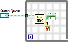 Du solltest die obere While Schleife direkt in das Status Anzeige VI implementieren und es soll parallel zu deinem HauptVI laufen.