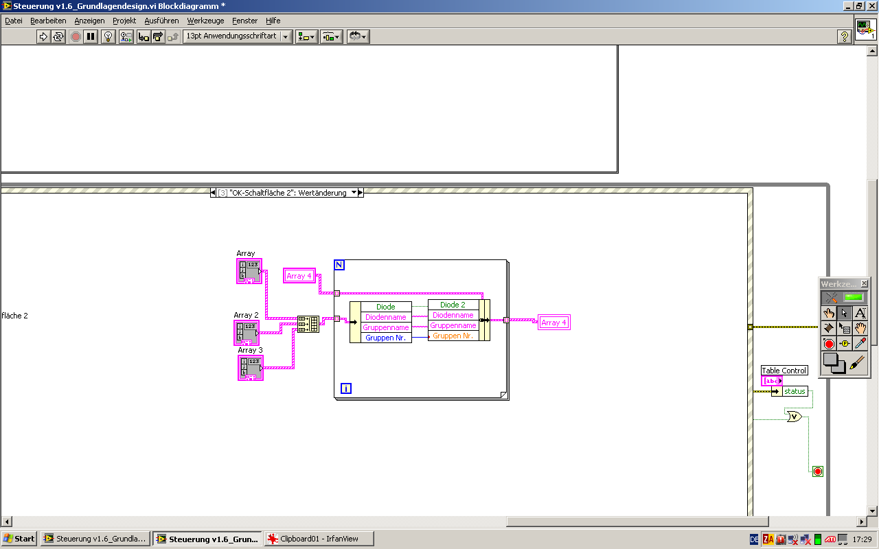 Aber ich möchte dieses Array nun in andere Arrays übergeben die auch aus Clustern ( auch 8 Elemente) bestehen. Diese sind dann Anzeigeelemente. Dieser Schritt funktioniert bei mir überhaupt nicht. Sowohl ein Versuch die Arrays über Komponentenweiser Zuordnung ( Bild 2 an Array 6) als auch als pauschale Übergabe ( Array 7 und 8) funktioniert nicht. Habe auch schon versucht, die Arrayelemente einzeln an die Zielcluster zu übergeben und diese nicht als Arrays zusammen zu fassen, funzt aber auch nicht ( daher die vielen Cluster im Bild 2 oben).