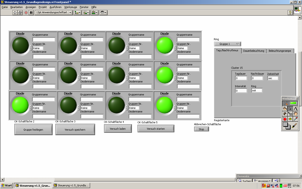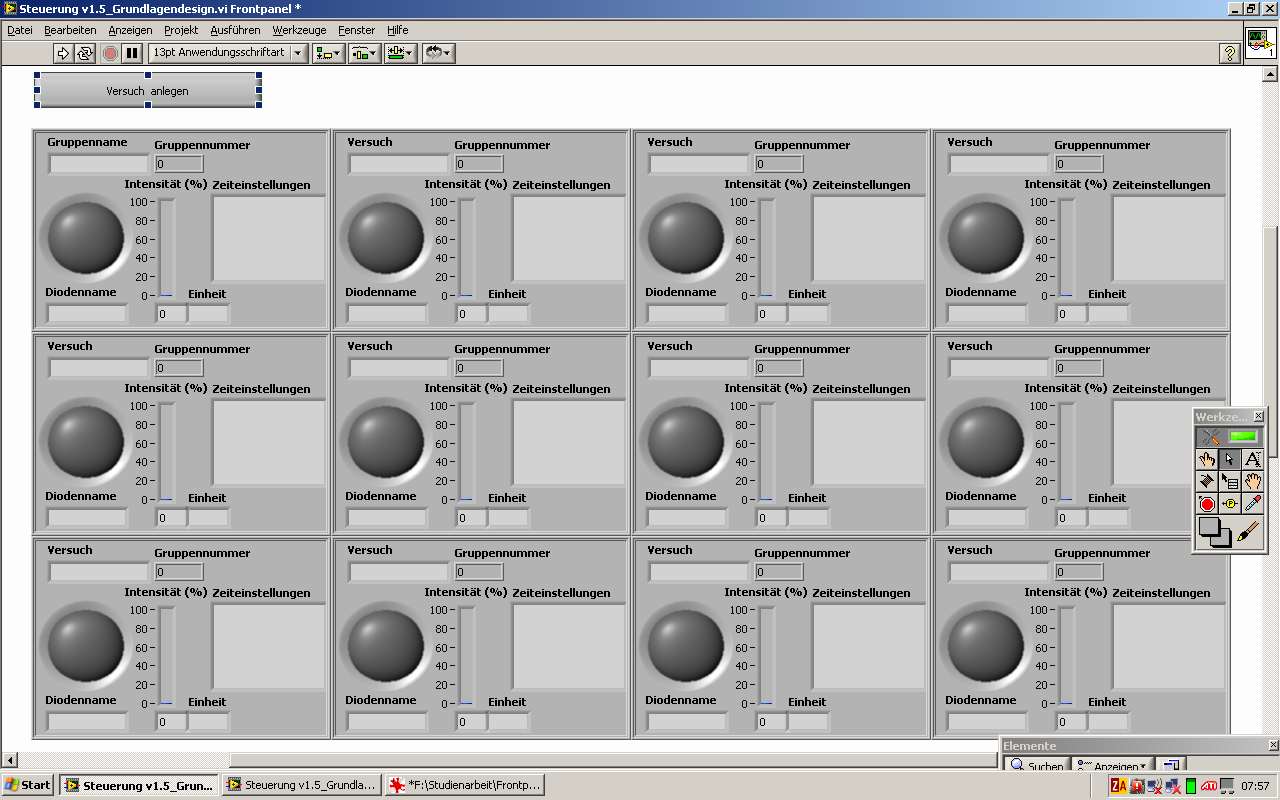 2. Ich habe eine Anzeige, die auch aus 3 Arrays besteht. Darin sind auch jeweils 4 Clusterelemente, aber mit jeweils 8 ! Komponenten (siehe Bild Frontpanel). In diesem Fenster werden dann die gewählten Optionen dargestellt und sind nicht mehr veränderbar.