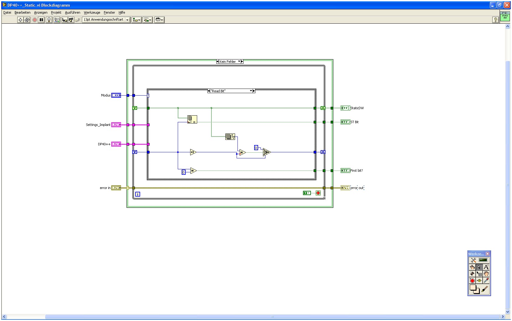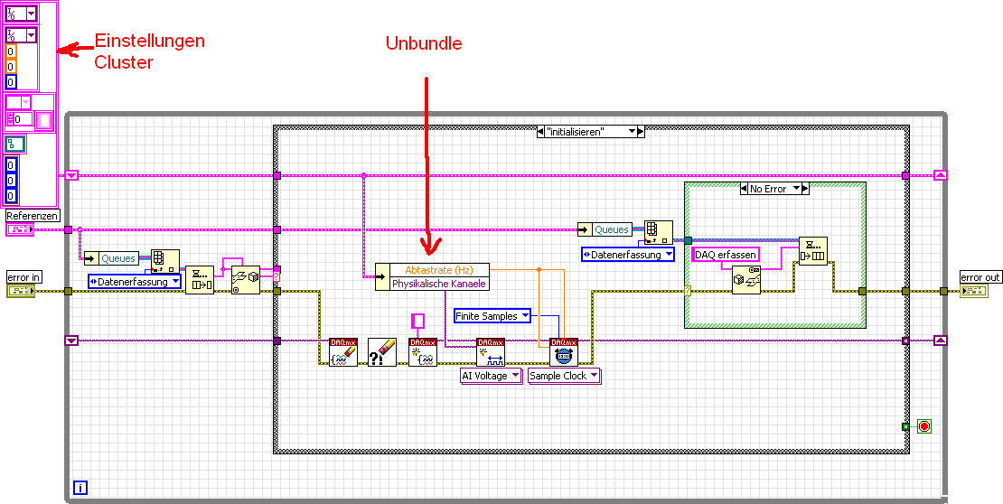 ' schrieb:Man muss nicht unbedingt ein Wire zum Weiterleiten von Daten verwenden. Es geht auch mit einem sog. funktionalen VI. Ein solches VI speichert die Daten - welches Format auch immer - in einem Schieberegister. Gesteuert wird dieses VI durch einen Enumeratoreingang. Der kann folgende Funktionen (Propertys) haben: SetzeDaten, LeseDaten, SetzeTeilDaten, LeseTeilDaten, AddiereZuArray, ResetteDaten etc. Vorteil: Bei vielen und komplexen Daten kann man sich alle Wire sparen. Außerdem sind die Daten quasi global.