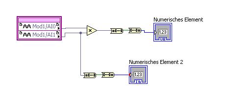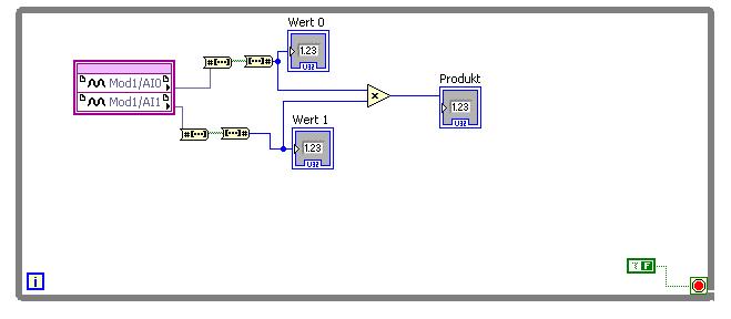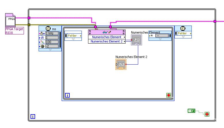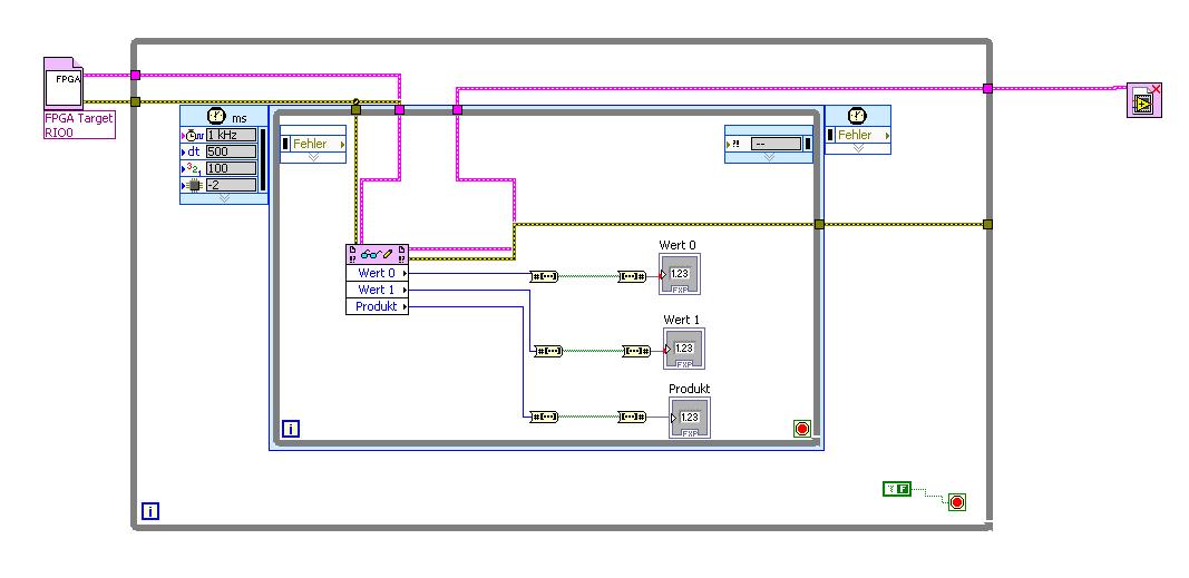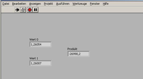 langsam bin ich am verzweifeln. Jetzt kann ich mir zwar die Werte anzeigen lassen aber wenn ich im FPGA noch eine Multiplikation durchführen will, kriege ich kein richtiges Ergebnis angezeigt. Hat jemand eine Idee ?? Im Anhang sind die VI als Jpg.