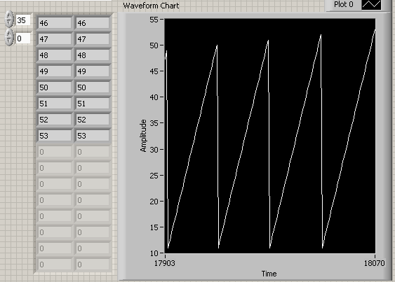 Also ich lade Daten in ein Array rein und laße diese mir auch auf der GUI ausgeben, hier sind in jeder Zeile 2 Werte die identisch sind (zu testzwecken nur), dies Daten steigen pro Sekunde um den Wert 1, daher habe ich mir vorgestellt das beim graph eine Rampe rauskommt, jedoch liefert er eine ZickZack Kurve welches ihr unten sehen könnt.