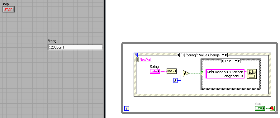 ' schrieb:Ok soweit so gut - dankeschön - und jetzt nur noch was ist das wo "String: Value Change" dasteht? Beziehungsweise hab ich im Moment ein Popup mit den 8 Zeichen maximal welches nicht mehr weggeht - was wahrscheinlich daran liegt, dass ich den false-Zweig nicht definiert habe oder?