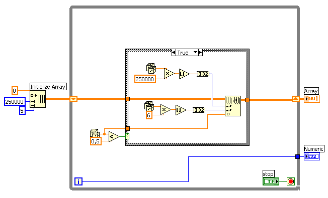 ich bin absoluter LabVIEWneuling und brauche dringend Hilfe (bin am verzweifeln). Ich habe dass Problem dass ich in einer for-Schleife 4 Speicherzellen (Leitungen) habe - in der ersten steht ein Wert den ich speichern will, in zwei aneren eine Zeilen und eine Spaltenangabe in welche dieser Wert in einem Tabelle/Array gespeichert werdn soll, und in der vierten ein boolscher Wert der angiebt, wann in diesen Speicherzellen etwas Sinnfolles steht (und gespeichert werden soll). Bei jedem Schleifendurchlauf wenn dieser Wert 4 auf "true" steht soll nun der Wert der in Zelle 1 in einen Array geschrieben werden - an der stelle die Zelle 2 und 3 angeben. Autoindizierung funktioneirte daher nicht, da ja nicht jeder Wert gespeichert werden soll. auch mit Schieberegistern ist das problem nicht lösbar, da der zu erstellende Array ca 5 MB groß ist (5*250000), und die Schleife zeimlich heufig durchläuft (ca2 mio.). Das heist wenn ich das problem mit schiebereigister lösen will braucht dass ewig (im bereich tage). Kennt jemand eine Möglichkeit einen Wert aus ene For-Schleife heraus an einen Array zu übergeben ohne den Array zu offnen??? Vielen dank für eine Antwort.